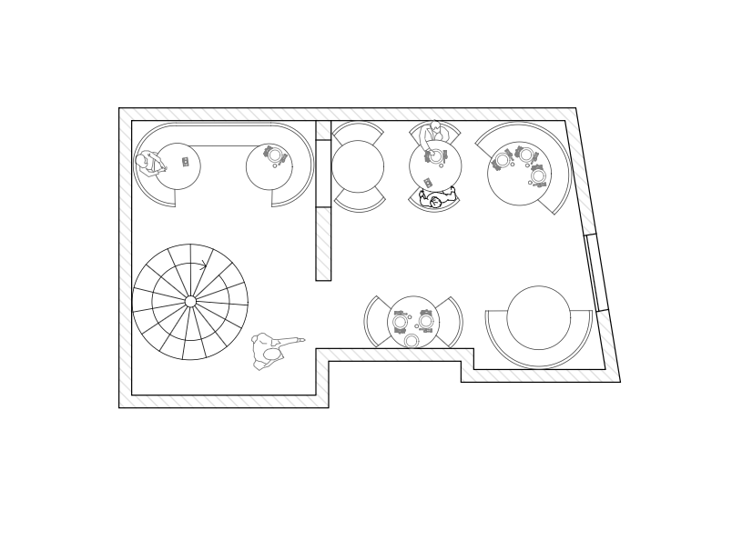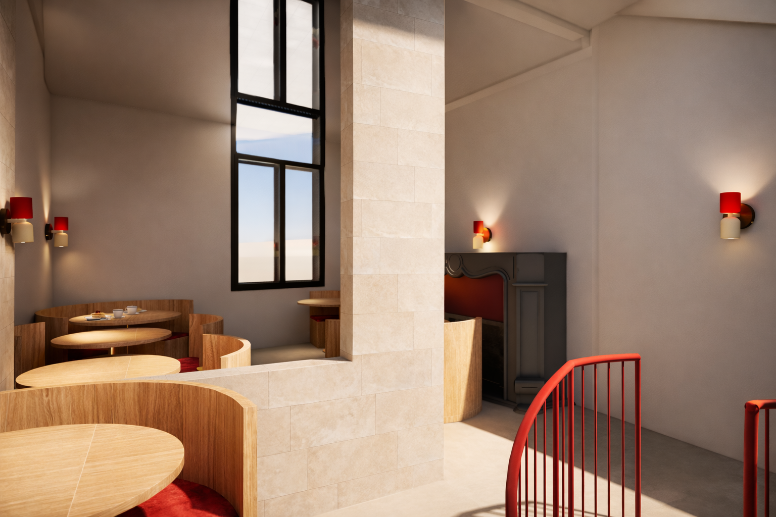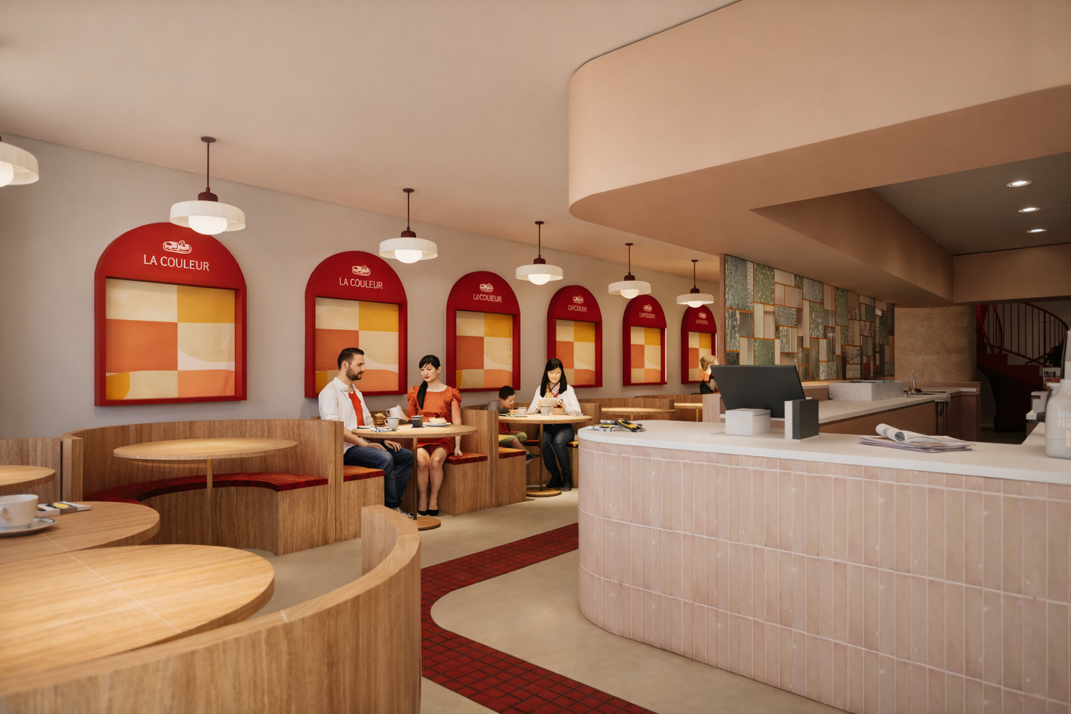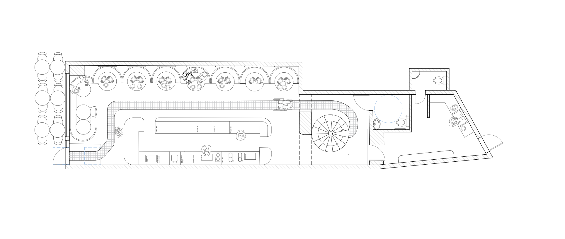 Pour optimiser les flux et favoriser les échanges intergénérationnels, une ouverture a été créée dans le mur en pierre afin d’aménager deux accès distincts, l’un pour le personnel et l’autre pour la clientèle, tandis que l’aménagement global, pensé autour de mobiliers modulables, permet d’adapter l’espace en fonction du nombre de convives.