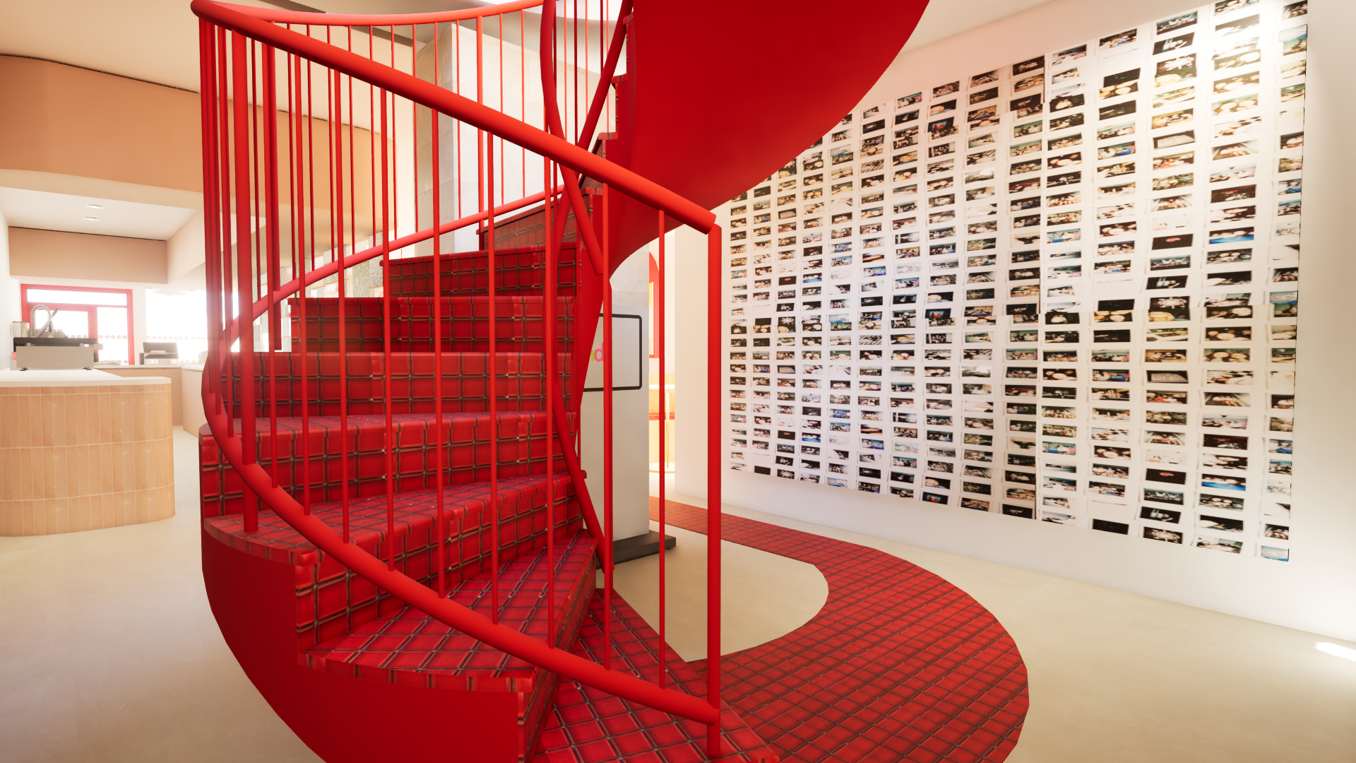 À l’étage, on retrouve la même configuration qu’au rez-de-chaussée, mais avec de grands miroirs au plafond à la place des papiers peints.